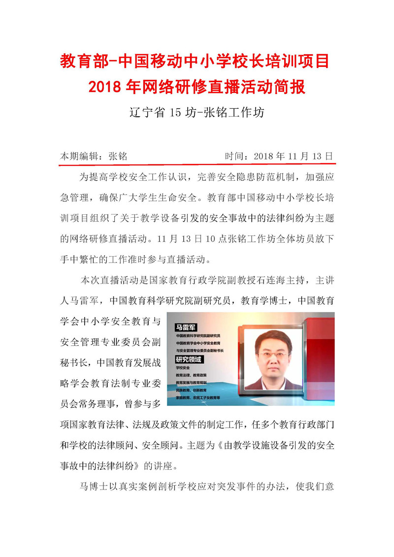 【遼寧第二期直播活動簡報】教育部——中國移動中小學校長培訓項目-遼寧15坊-張銘坊網絡直播第二期簡報