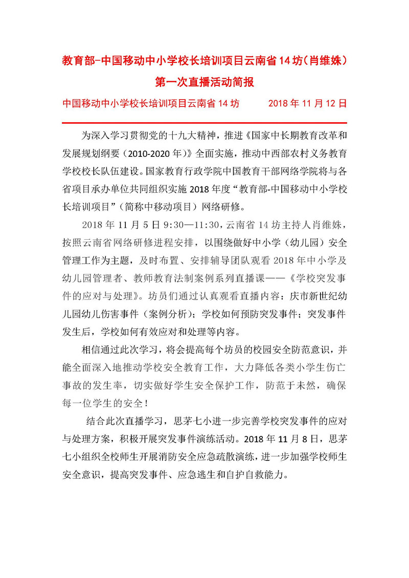 【雲南第一期直播活動簡報】教育部——中國移動中小學校長培訓項目-雲南省14坊(肖維姝)第一次直播活動簡報