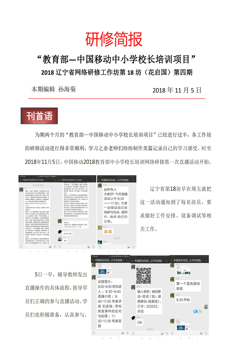 【遼寧第一期直播活動簡報】教育部——中國移動中小學校長培訓項目-本溪市明山區花啟國工作坊第四期研修簡報