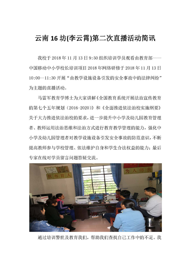 【雲南第二期直播活動簡報】教育部——中國移動中小學校長培訓項目-雲南16坊(李雲霄)直播(第二次)活動簡訊